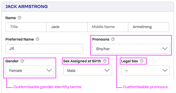 And you have the flexibility to fully customise the options you have available for gender identity terms and pronouns as well.