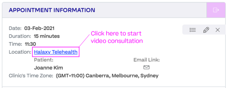 2. Click the "Halaxy Telehealth" link to start the consultation.