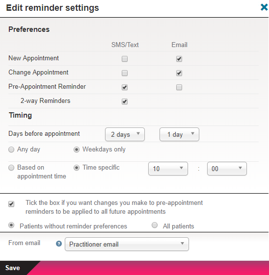 You can now choose the specific time that you would like your email or SMS reminder to be sent in addition to the number of days before the appointment that it is sent, giving you the flexibility to choose a time/day that is best for your patients.