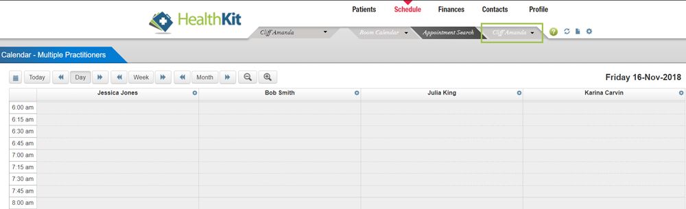 If you are in a group practice and have an access level that allows you to view others' diaries, you can view multiple practitioners' calendars all together in the Day view of your calendar - which makes appointment and practice scheduling easier and simpler.