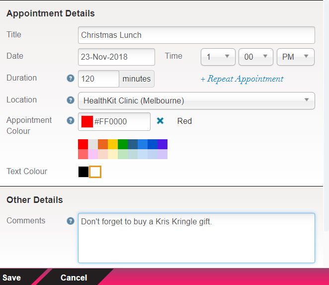 You can also select a colour for the appointment, and for the text on the appointment - so when you make another personal appointment with the same title, Halaxy automatically prepopulates the appointment colour and duration for you.