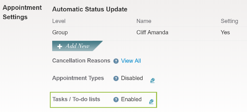 - Under Appointment Settings, click on the pencil icon next to Tasks/To-do lists.