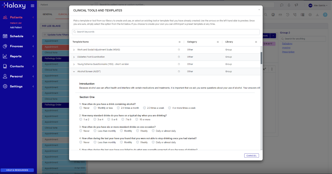 Whether you are recording assessments, tracking progress over time, or capturing key clinical insights, Halaxy’s Clinical Template Library is designed to save you time and allow you to deliver care more efficiently.