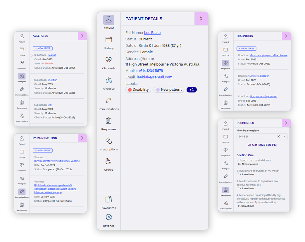 See key patient health details at a glance: Instantly view immunisation, allergy, and diagnosis histories directly from your Clinical Sidebar, while simultaneously viewing your case notes. It is the easiest way to get a clear snapshot of your patient’s health during your consultation, all on the one screen.