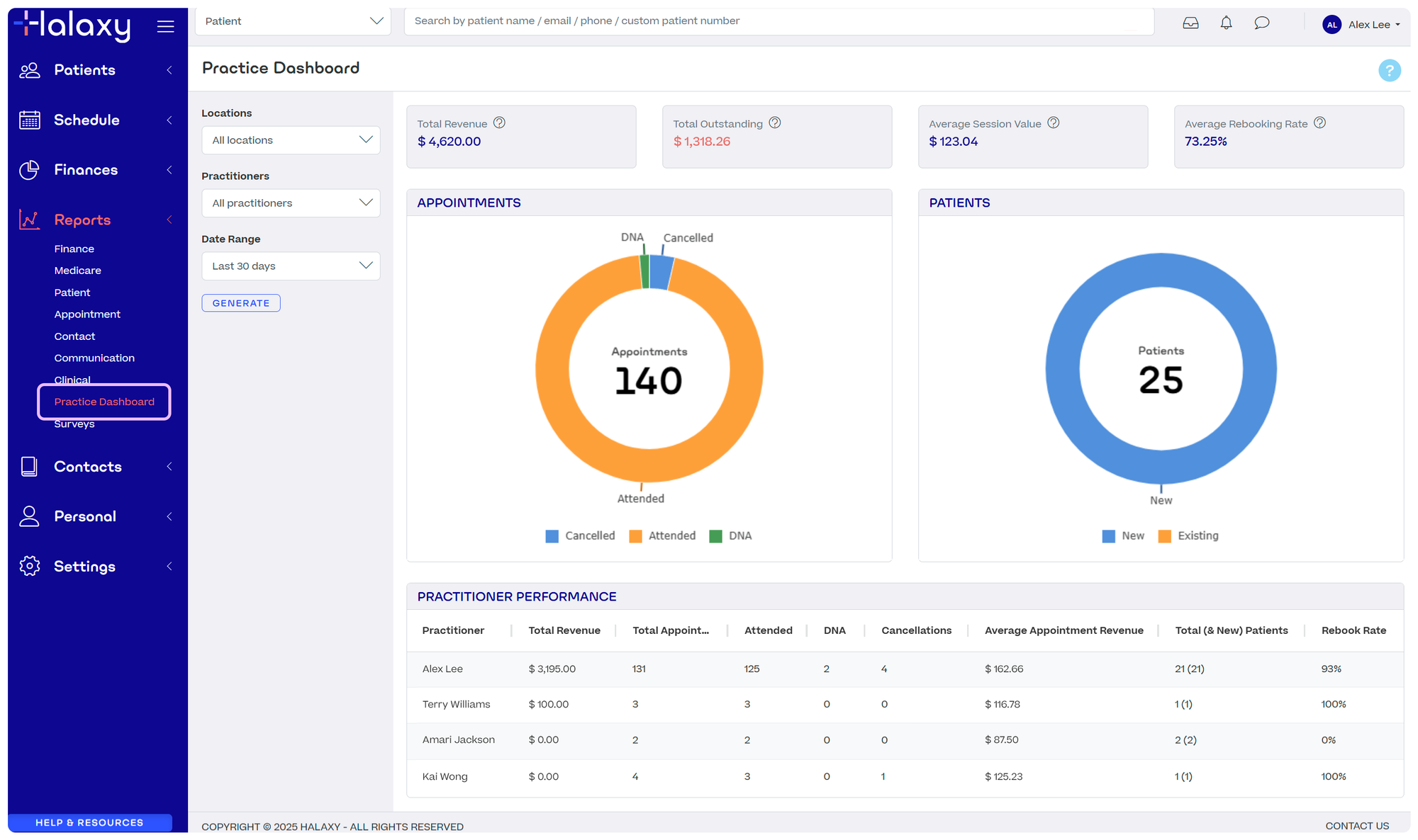 Halaxy's Practice Dashboard gives you a visual overview of your practice’s key performance information all in the one place, helping you make more informed decisions about how to run your practice, and how to grow it when you’re open to taking on new patients. With the Practice Dashboard, available now in your account, you can: